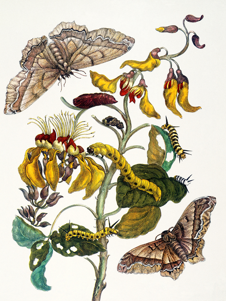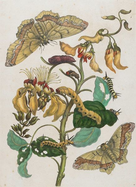 28-år gammal Maria Sibylla publicerade sin första bok med illustrationer ”Neues Blumenbuch” (1675) och kort därefter släppte hon ”Der Raupen wunderbare Verwandlung” (”Den mirakulösa omvandlingen av larven och dess speciella blomsaft”), där hon med egna etsade koppartryck framställde larvernas metamorfos. Illustrationer som hon utförde är som en liten konstverk. Alla är handfärgat!