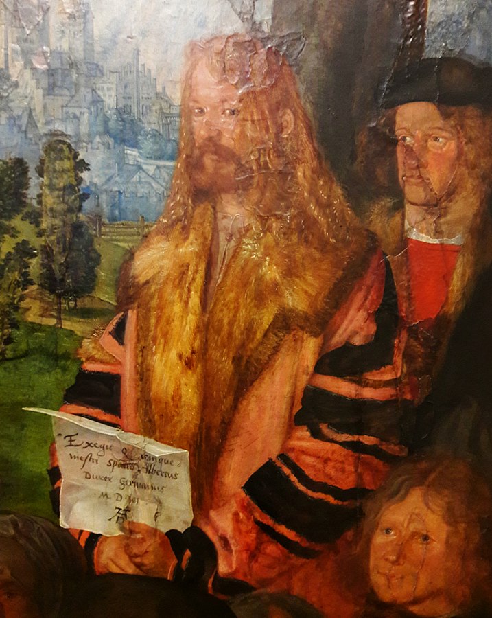 Durer avbildade sig själv på höger sidan av tavlan.