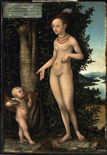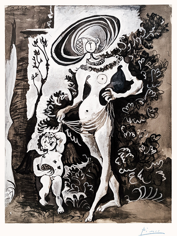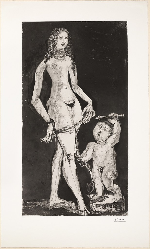 Redan 1942 hade Picasso gjort en tuschteckning i stort format efter Cranachs träsnitt av samma ämne (från 1509). 1949 återkommer han till temat i en serie där målningen ”Venus och Amor” interpreteras på nytt. Första variant är mer kubistiskt för att sedan blir det mer figurativ.