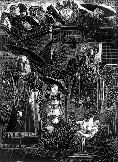 Picasso beundrade hos Cranach hans arkaisk stil, trots renässansartade lösningar. När man kollar närmare på original upptäcker man hur Picasso byggde upp sin komposition och gradvis förandrades. Arkitektur är fortfarande viktigt för figurernas placering.