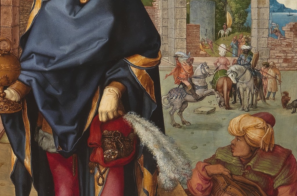 I sitt kända verk ”Konungarnas tillbedjan” framställer Dürer tre vise männen som exponerar sin vördnad för det nyfödda Jesusbarnet. Enligt Bibeln kom de långväga ifrån och de har fått representera varsin av tre världsdelarna: Europa, Asien och Afrika. Därför brukar åtminstone en av konungar avbildas som en färgad man, vilken ibland tolkats som Balthasar och ibland som Caspar.