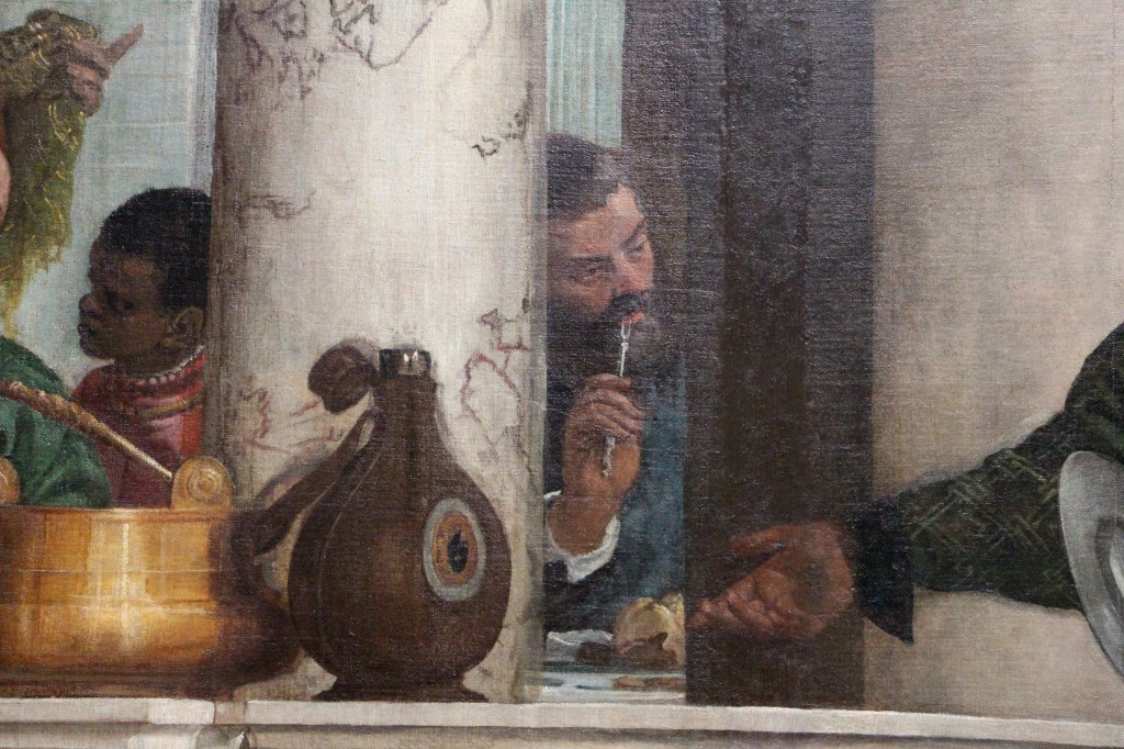 Konstnären skulle måla om duken. Veronese undergav sig inte domen och ändrade bara titeln till ”Festen i Levis hus”, vilket också tillfredsställde den heliga inkvisitionen. Tack och lov att det slutade så oskyldigt. Den enorma duken gjorde säkert ett stort intryck på betraktare. Det händer så mycket på festen i Levis hus!