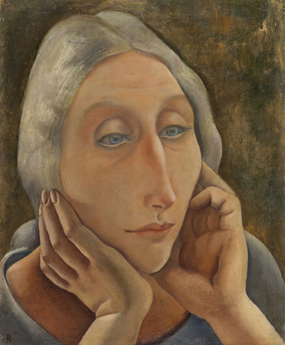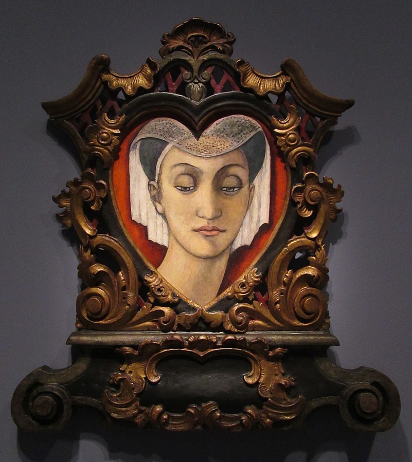 Anita Rée porträtterade Bertha, hembiträdet i Wriedt-handelsfamiljen och en av hennes favoritmodeller, i många bilder. Här framträder hon som en dam i tidig renässansstil, inom en barockram. Vilket fantastiskt exempel på att mixa stilar!