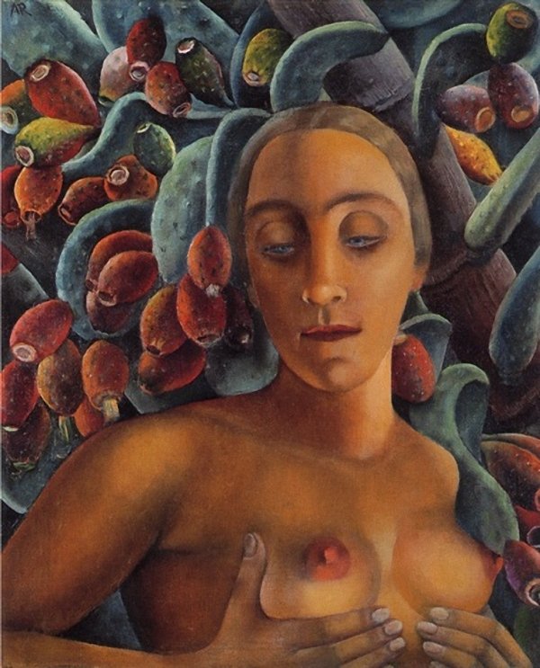 Framför frodiga kaktusar omfamnar en halvnaken avbildad kvinna sina bröst. Hon sänker blicken, sina symmetriska ansiktsdrag översätter konstnärinnan till geometriska former av ovaler och halvcirklar. Samspelet mellan bröstvårtornas färger och former med de runda, taggiga frukterna framkallar en erotiskt laddad atmosfär. Kroppen och naturen blir ett.