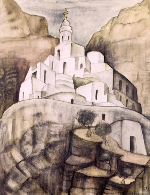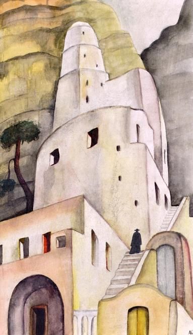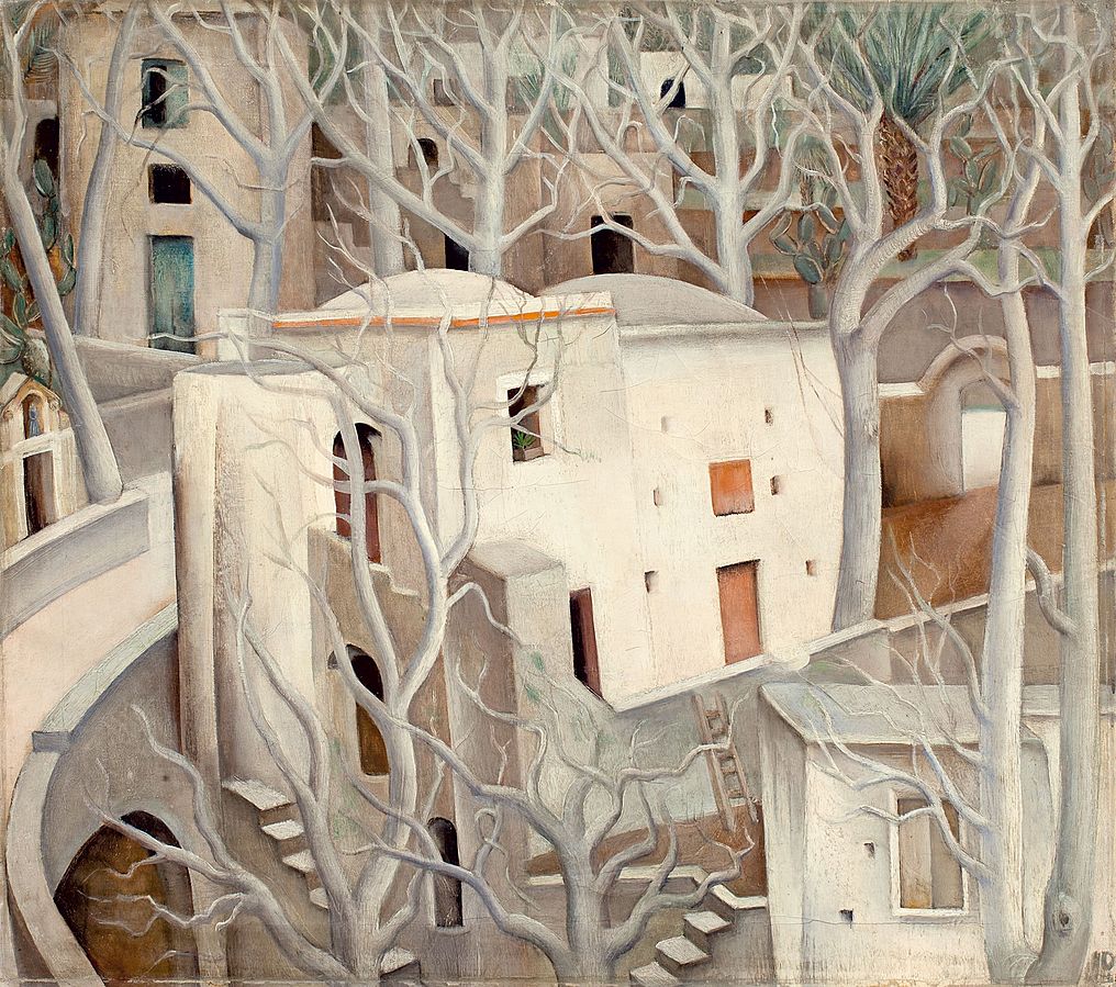Ljusa grenar löper genom bilden, byggnader i kubiska former visar spår av människlig närvaro, men det finns ingen levande varelse i scenen! Trappor leder ingenstans, arkitektoniska strukturer är knappast begripliga som bostäder. Det är en gåtfull tavla. Började hon kanske känna sig isolerad?