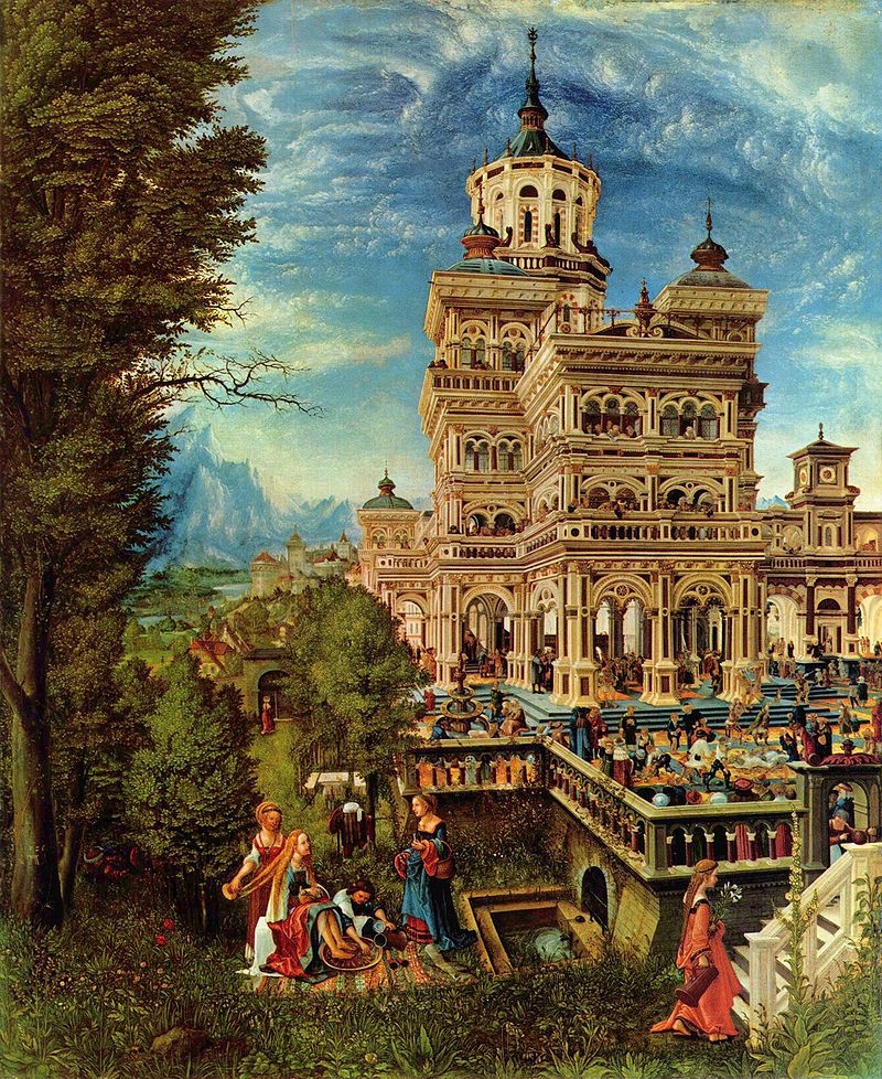 Albrecht Altdorfer (1480-1538), en tysk konstnär från Donau-skolan lade huvudvikt på presentationen av Joakims sagopalats med omfattande terrasser och trädgårdar. Byggnaden är fylld med människor. Bland alla detaljer placerade konstnären olika trådar ur samma historia. Till vänster träffar vi Susanna som förbereder sig för att bada. I buskarna syns knappt två gamla män som tittar på flickans toalett. Scenen fortsätter.