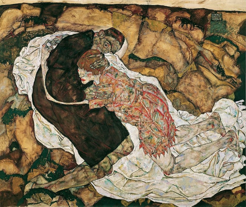 Den hela situationen ledde till att Schiele målade ”Döden och Jungfrun”. Verket är förmodligen ett självbiografiskt svar på det avslutade förhållandet med Wally. Målaren gifte sig med Edith Harms och fördes också in i militärtjänst under första världskriget. Dödens närvaro, eviga sambandet mellan döden och kärlek i flera av hans verk är förknippad med tavlan. Motivet ”döden och jungfrun” har varit känd sedan renässansen: kvinnan omfamnar döden som är hennes älskare, men döden skrämmer inte. Figuren är inte avbildad traditionell som ett skelett, utan i munkens kläder och förlorar faktiskt sin ohygglighet… .