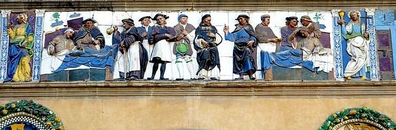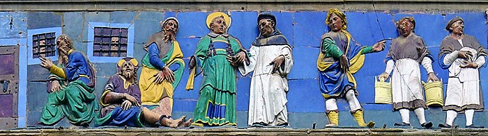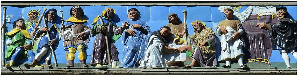 Hans son, Giovanni della Robbia (1469-1529) inherited the workshop after his father’s death and improved methods for producing multicolored (polychrome) sculptures in a faster and more efficient way. Giovanni’s greatest and perhaps finest work was the polychrome frieze on the outside of Ospedale del Ceppo, designed between 1514-1529. The subject was associated with the hospital’s activities. Giovanni designed ”Seven Works of Mercy”:
