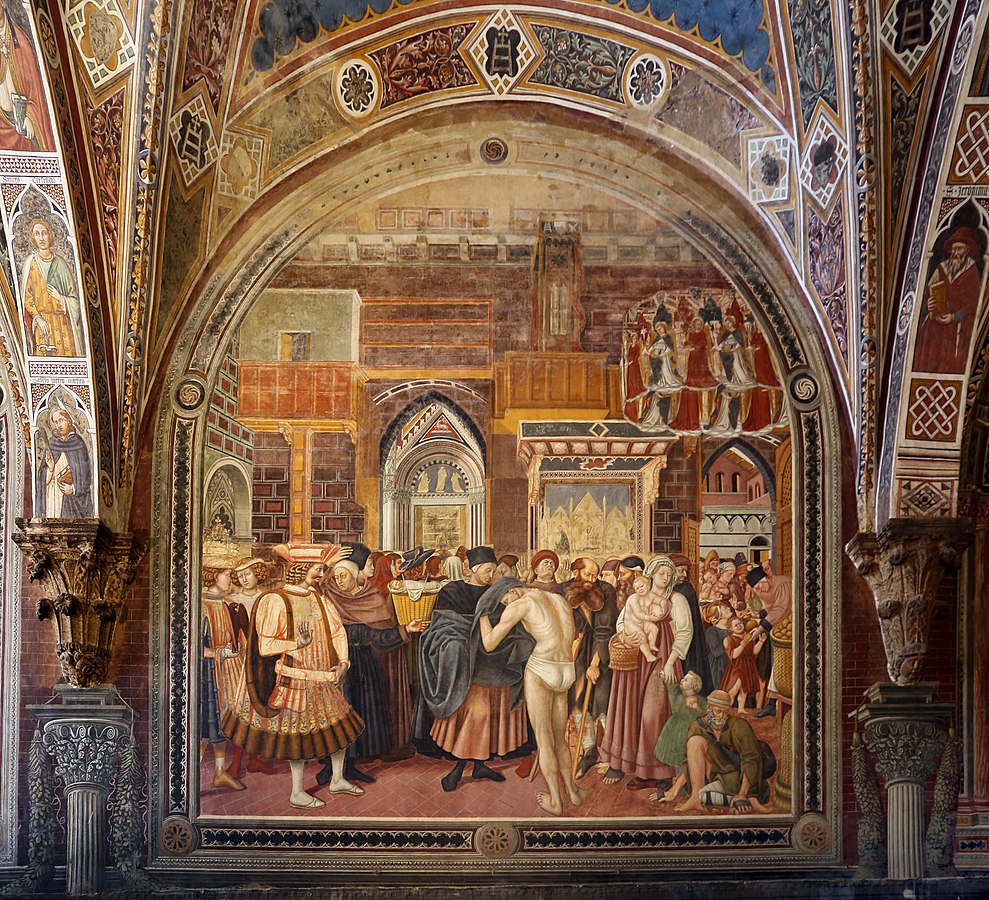 Domenico di Bartolo (ca. 1400-ca.1447) fick uppdrag att föreställa sjukhusets välgörenhet i form av fresker till Sala del Pellegrinaio (1439-44). Det är konstnärens sista färdiga verk och absolut hans mästerverk. Målningarna illustrerar det dagliga livet såväl som sjukhusets historia. Domenico utformade fem scener med imponerande detaljer, där han skildrade verksamhetens vardag.