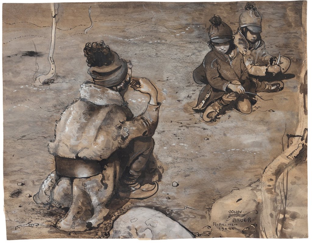 ”Lappar i snöstorm””Rast under flyttningen, Sydlappar””Kaffekokning i skogen. Jukkasjärvi””Pojkar från ett läger i Ripainen, Jukkasjärvi”(1904) Gouache, tusch och täckvitt på papper 22,5 x 32,5 cm Bukowskis