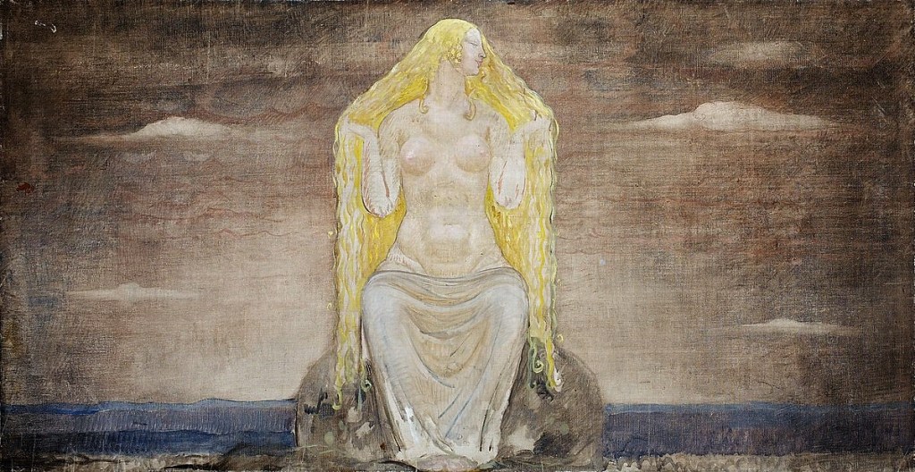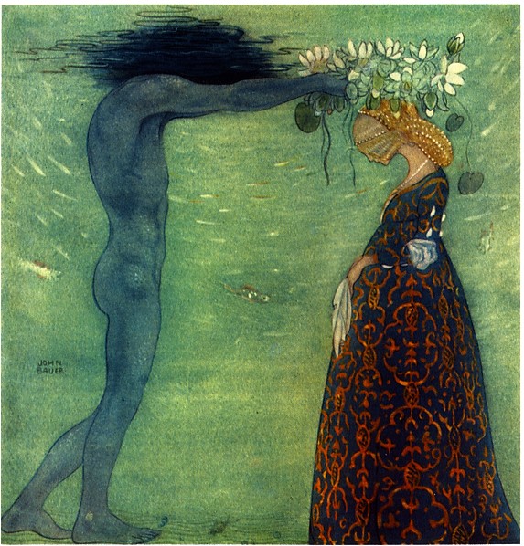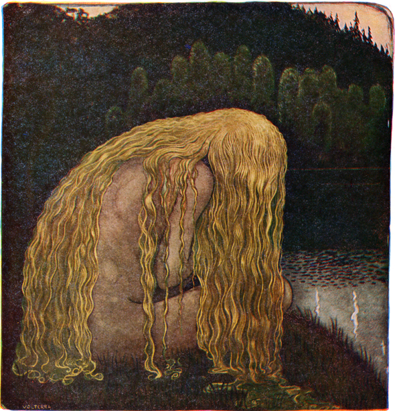 ”Agneta och sjökungen” (1910) av Helena Nyblom Riddardottern dröjer sig kvar vid sjön och rövas bort av sjökonungen, som gör henne till drottning i sitt undervattensrike. Där tillbringar hon sju år glömsk av sitt tidigare liv. Men en söndag tränger ljudet av kyrkklockorna ned i djupet, och hon utber sig för att få besöka gudstjänsten. Hon upplever då sin gemenskap med människorna, och när sjökungen vill hämta henne vägrar hon att följa med tillbaka.De