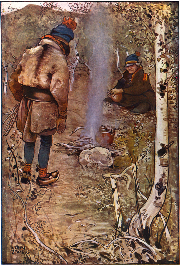 John Bauer påbörjade en månadslång resa till Lappland sommaren 1904 och dokumenterade tillsammans med flera andra konstnärer och fotografer samernas vardag. Han skisserade naturen, okänd för honom tidigare, inklusive framför allt de hårda, nästan trädlösa landskapen och samernas exotiska beteende och dräkt. När han återvände gjorde han en serie akvareller, varav 11 dök upp i en kollektivbok som sammanfattade expedition ”Lappland : Det Stora Svenska Framtidslandet – En skildring i ord och bild af dess natur och folk” (1904). Detaljer återkommer ofta i Bauers sagoillustrationer.