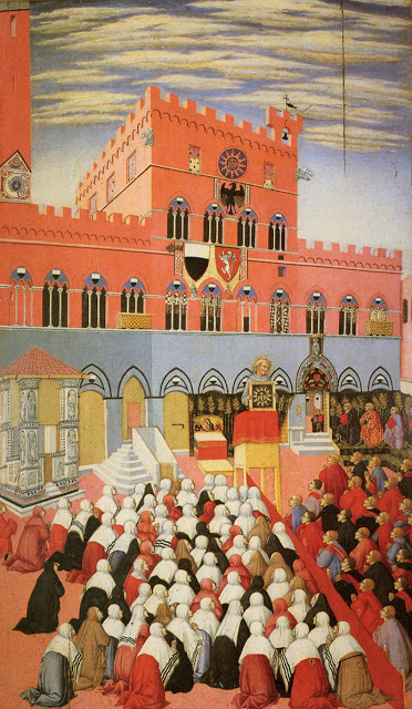 Ospedale della Scala i Siena fanns här från 1100-talet och blev ett separat institution inom kyrkans Santa Maria della Scala verksamheten. Objekten grundades från privata donationer av Sienas medborgare. Intäkterna räckte att servera måltider till fattiga, behandla de sjuka och framför allt att ta hand om överlämnande barn.