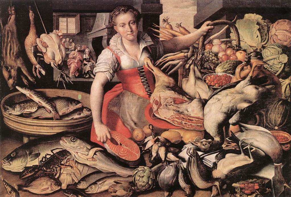 ” Köket” (1580-90) oil on canvas, 145 x 220 cm Pinacoteca di Brera, MilanoVincenzo Campi ”Pescivendoli ” ”Fisksäljare”(1579), oil on canvas, Musee de la Roche-sur-Yonne”Kristus hemma hos Marta och Maria” (ca.1580) Galeria Estense; Modena”Kvinna som säljer frukter” (1580) Pinacoteca di Brera, Milano